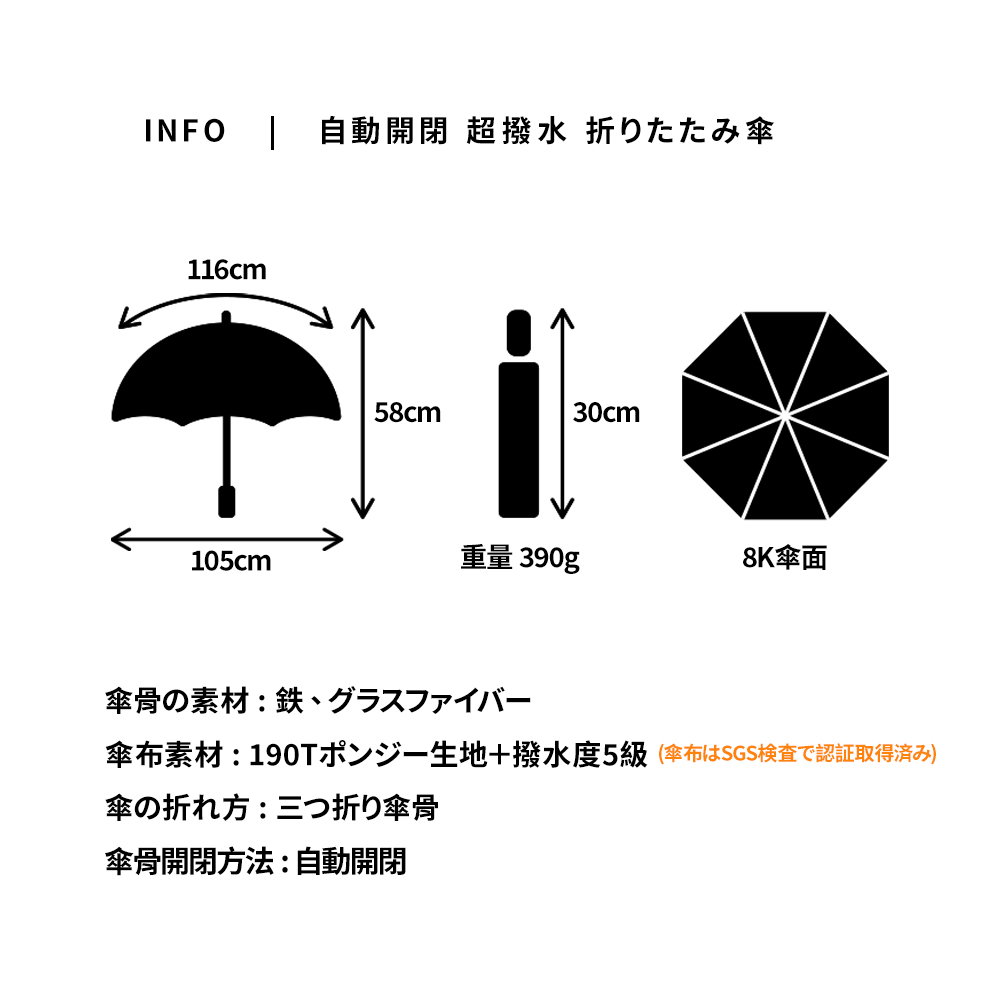 自動開閉 超撥水 折りたたみ傘 AUTO UMBRELLA SIZE親骨の長さ 58cm直径 105cm全長 58cm QUALITY生地 190Tポンジー撥水度5級加工原産地 中国製 品番 |RL3014S001 グレー002 あいいろ003 フォレストグリーン004 マスタードイエロー